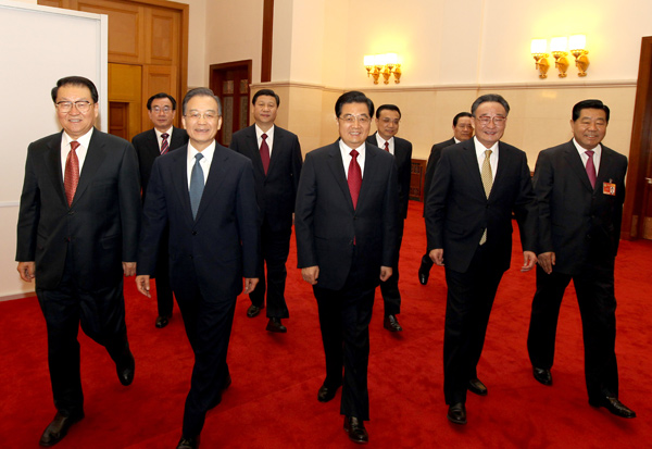 3月3日下午,中国人民政治协商会议第十一届全国委员会第三次会议在北京人民大会堂开幕。这是党和国家领导人胡锦涛、吴邦国、温家宝、贾庆林、李长春、习近平、李克强、贺国强、周永康等步入会场。新华社记者兰红光摄