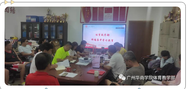 本次活动,在体育教学部主任顾伟农教授带领下,大家一起学习了“广州华商学广州华商学院关于开展2023年师德建设主题教育月活动的通知”精神和“新时代教师职业行为十项准则”。