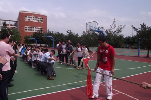 当天下午天气晴朗,清风拂面。赛会工作人员早早抵达现场进行准备工作,参加拔河比赛的教工们也纷纷到场。有些教工更是全家出动,为参加比赛的家人呐喊助威。伴随声声哨响,一场场别开生面的比赛随即展开。平日里在讲台或办公室衣冠齐整的教工,此时为了各系部的荣誉暂时撇开“形象”,一起咬牙使劲往后拔。在旁边观战的同事、亲友团也没闲着,拍照、录像、擦汗、递水,让整场拔河比赛充满了温馨和睦的氛围。
