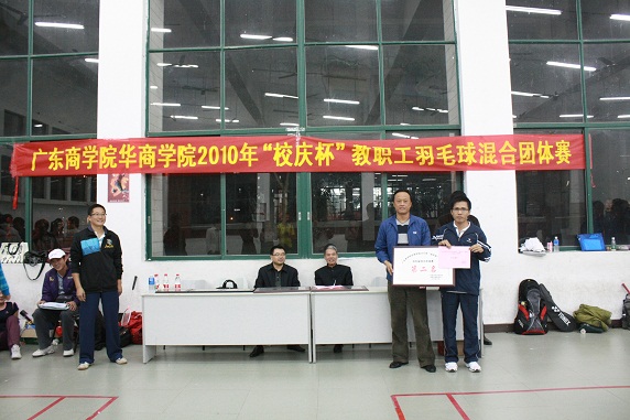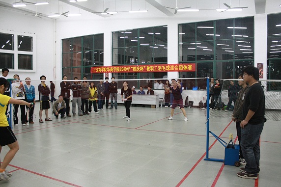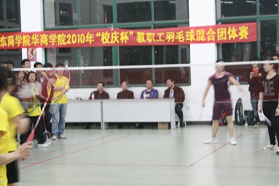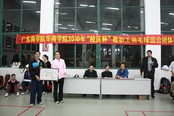 2010年12月24日下午5:10,体育教学部承办的广东商学院华商学院2010年“校庆杯”教职工羽毛球混合团体赛决赛在励志楼B108羽毛球馆内举办了别开生面的羽毛球比赛,各位老师积极参与其中,热闹的馆中洋溢着大家的欢乐与青春。学院党委书记黄虹书记、体育教学部张建伟主任、信息工程系骆耀祖主任、体育教学部办公室李应出席观看了本次决赛,并为获奖代表队颁奖。