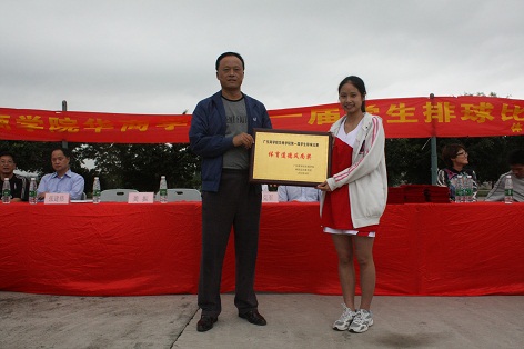 体育教学部张主任给获得体育道德风尚奖旅游管理系队颁奖